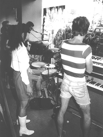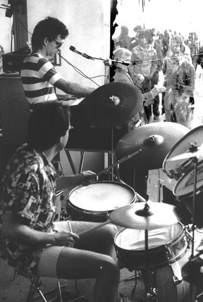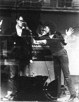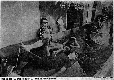 ![]() Take 5 with Jeff Jarvis S.F. EXAMINER, Fri., Jan. 26,1979, page 5 "Punk Under Glass" It was a beautiful day for punk rock, even at Fifth and Market. But this was not just punk rock. This was art. Behind the windows on the Fifth Street side of the J.C. Penny building yesterday stood a punk rock band called The Units. In front of the building were bums, businessmen, passers by and punk rock fans. The windows, you see, have been turned into an art gallery of sorts for a running exhibit called, appropriately enough, "Windows." It runs through next month, with a different artist taking the space every week. This was Kal Berlones' week. This is art: The windows had been painted black, and then much of the paint was scraped off. The scraping was part of the live artwork from the day before. Behind the center window stood the band, two on keyboards and one on drums. Behind them were a fake and ugly tigerskin and some plywood guitars -- without strings. And atop one of the electric keyboards stood a plastic champagne glass and a carton of milk. Beginning to feel the mood? At window right, there was a beach chair, a sun lamp -- not plugged in, and four people in sunglasses and beachwear. They were sunbathing. As time went on, they took the plywood and posed with them in playing position. But they didn't play. Above them was the banner: "ON VACATION FROM WHAT?" At window left, there was a model in a platinum wig and a go-go dancer. Above them was a banner: "DO YOU LIKE YOUR JOB?" "It's a holiday theme -- on vacation." Berlones explained backstage. "Its just such a great space, you have to ham it up." Is there a greater message to all this, or is it just entertainment? "I hope people get enterainment -- diversion." She said some philistine across the street called the police on them -- complaining of too much noise from the loudspeaker outside the window. Too much noise at Fifth and Market? Has he no appreciation of art? How do you like it? We asked a woman who walked by. "Well..." she said, and there was silence. Are you a fan of punk rock? "I'm a fan of South and Market," she said. "I like street theater. This isn't really street theatre -- It's window theater." What do you think of the show? we asked a young woman who was feeling the rhythm and hugging a parking meter. Her name was Candy. "It's not a show. It's an exhibit," she said. "Listen to the words. They're in there because they can't be out here because in there there is air. They only way you get air is air conditioning." We were still digesting that while she continued. "The people over there (she said pointing to the window left) are in a bar, they don't know what's going on over here (pointing to window right). Vacation. Like it says, vacation from what? You come back from vacation to this bull.." Are you an artist? "No." Did you just wander by? "Yeah. I do that." |