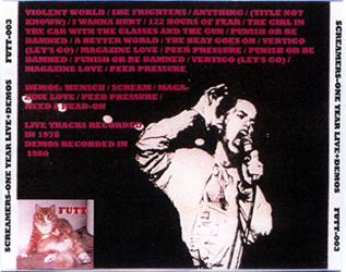 | B2, C1, D1: | First Screamers demo session, 7-7-77 on a TEAC 2340 4-Track, produced by Pat Garrett. |