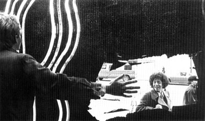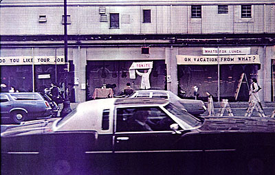 Market Street San Francisco * California Special help from: Kal Berlones, Scott Ryser, The Units, Tom Matty, Ernest Fritz and Diane Daniels. Windows organized by Michael Osterhout. The piece took place inside the display windows of the J.C. Penny building, downtown San Francisco, from 10:00 a.m. to 5:00 p.m. The audience was anyone who happened to be walking by on the street. I painted the windows black on the inside. About seven people came on the day of the performance to participate. I instructed them to stand very close to the inside of the windows. I began to scrape away the paint which revealed certain parts of their bodies on the the outside of the windows. Behind them on the walls of the display area, I projected slides I had taken previously at the windows of people walking by on the street, among other slides I had taken. A San Francisco synthesizer band called the Units were simultaneously playing their music which helped illustrate and enhance the mood of the action. As the day progressed, more paint was scraped away and more of what was behind the glass was revealed to the public. The piece ended when there was no more paint on the windows. -R.W. (Rachel Webber) |